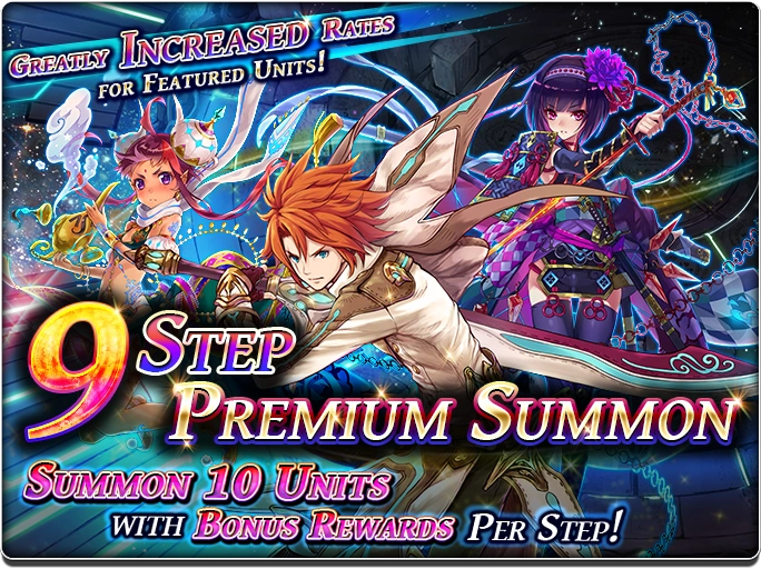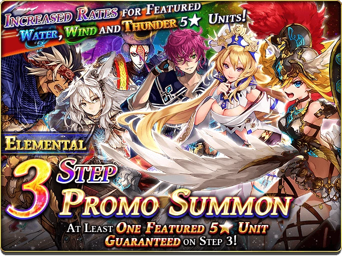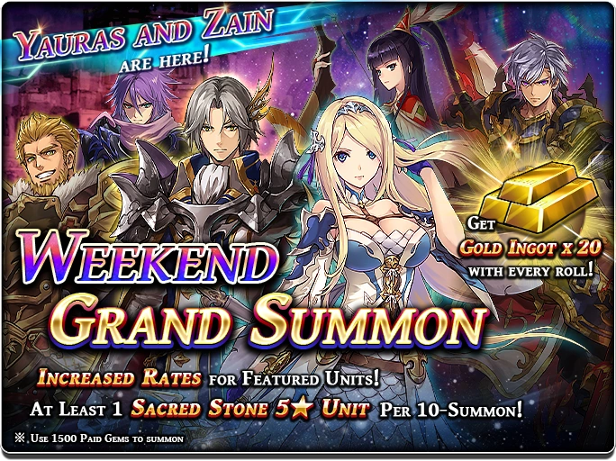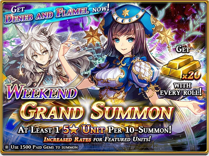 Aside from regular banner there is another type of unit banner called Grand Summon. These types of banner are usually available during the weekend. Only Paid Gems can be used to do this kind of banner. These banners have guaranteed units with higher summoned rate of 5* units along attractive freebies. Typically, these unit banners cost between 1500 to 2500 Paid Gems depending rate of 5* summon and freebies.